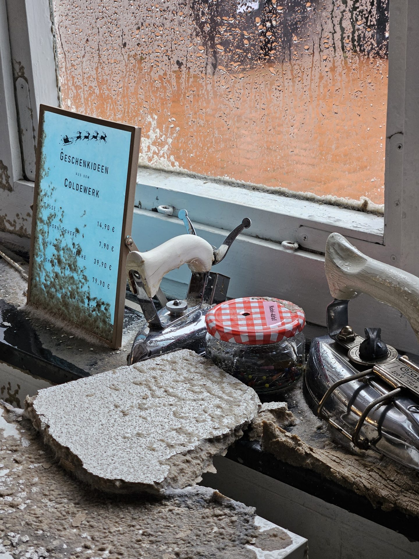 Zwischen Weihnachten und Neujahr kam es im Coldewerk zu einem massiven Wasserschaden im Nähsaal. Ursache war ein geplatztes Eckventil in der Wohnung über dem Laden. Der Mieter war verreist – ich war nicht da!